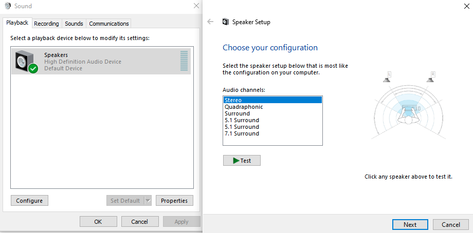 (To get to “Speaker setup”, you need to right click on your device then click on configure speakers)